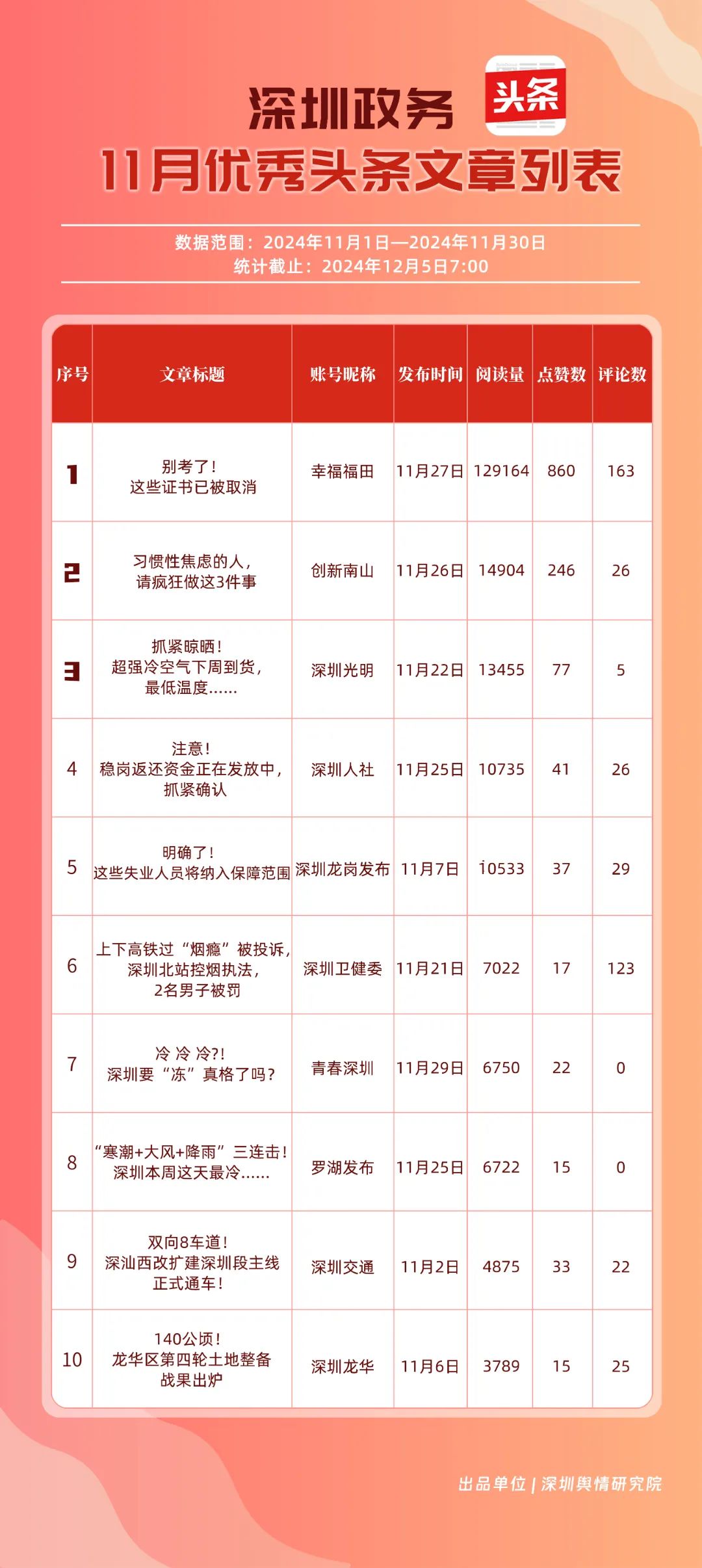 11月,“幸福福田”“深圳龍崗發(fā)布”“創(chuàng)新南山”“深圳人社”“深圳龍華”“深圳光明”“濱海寶安”“坪山發(fā)布”“深圳衛(wèi)健委”“羅湖發(fā)布”共10個(gè)政務(wù)頭條號(hào)入選“優(yōu)秀政務(wù)頭條號(hào)”榜單?!靶腋8L铩卑l(fā)布大量民生相關(guān)信息,穩(wěn)居第一。“深圳龍崗發(fā)布”同樣表現(xiàn)不凡,排名始終位于前列,展現(xiàn)了其在信息傳播與政務(wù)服務(wù)方面的卓越能力。此外,賬號(hào)“創(chuàng)新南山”“深圳人社”“深圳龍華”“深圳光明”在榜單中的排名有所提升,為政務(wù)新媒體樹立了典范。