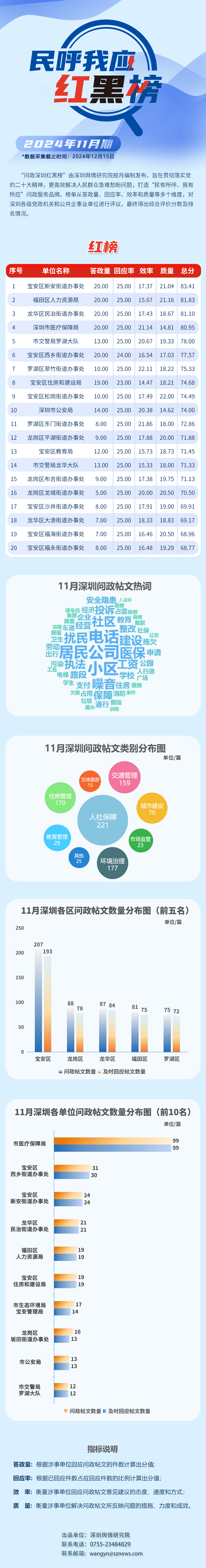 “深圳民呼我應紅黑榜”由深圳輿情研究院按月編制發(fā)布,旨在貫徹落實黨的二十大精神,更高效解決人民群眾急難愁盼問題,打造“民有所呼、我有所應”問政服務品牌。榜單從答政量、回應率、效率和質(zhì)量等多個維度對深圳各級黨政機關和公共企事業(yè)單位進行評議,最終得出綜合評價分數(shù)及排名情況。