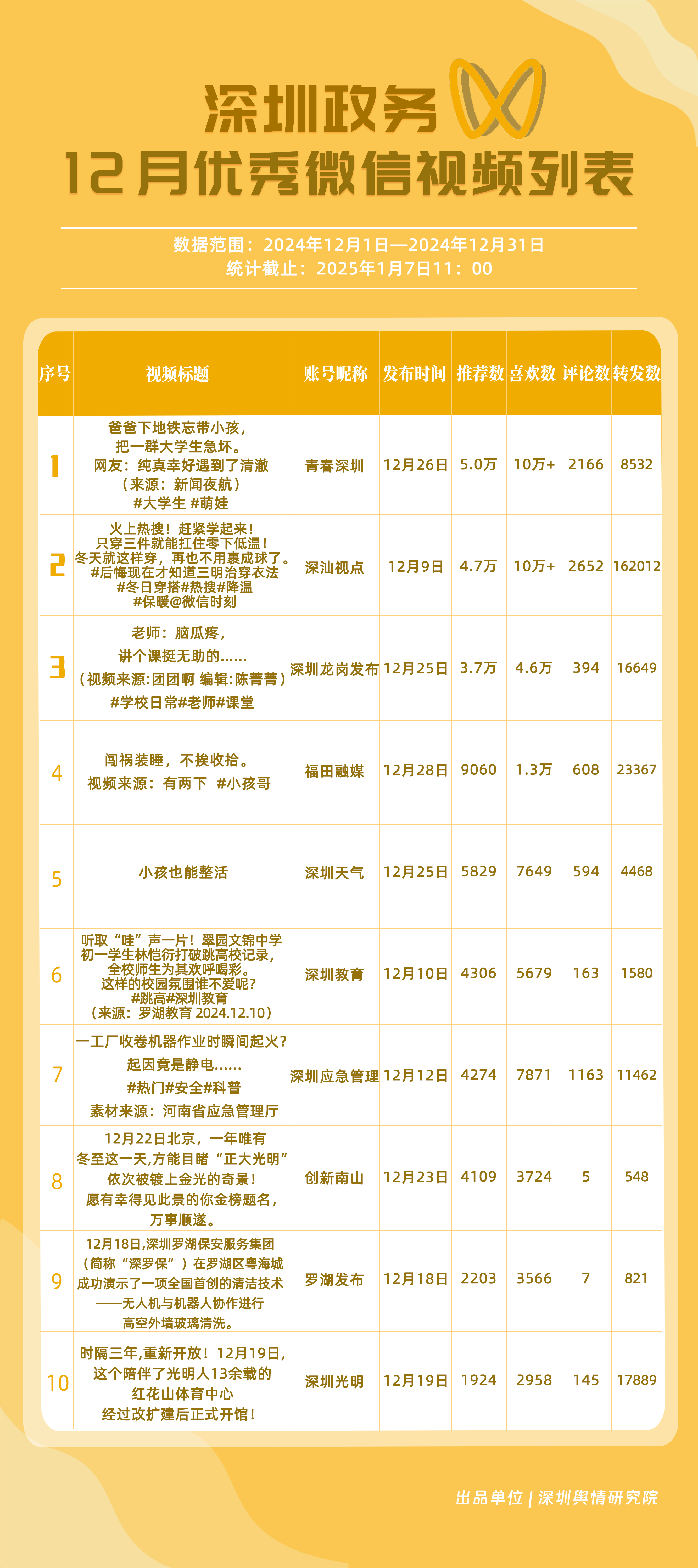 12月,“深圳衛(wèi)健委”“深圳天氣”“深汕發(fā)布”“掌上龍崗”“深圳光明”“DOU愛(ài)龍華”“魅力福田”“青春深圳”“深圳交警”“深圳工會(huì)”共10個(gè)政務(wù)抖音號(hào)獲得“深圳優(yōu)秀政務(wù)抖音號(hào)”稱號(hào)?!吧钲谛l(wèi)健委”在互動(dòng)、傳播方面成績(jī)優(yōu)異,助推其位于榜單首位?!吧钲谔鞖狻薄吧钌前l(fā)布”“掌上龍崗”則各有所長(zhǎng),綜合排名位于榜單前列,內(nèi)容產(chǎn)出豐富、用戶互動(dòng)高頻,信息傳播廣泛,共同展現(xiàn)了政務(wù)抖音號(hào)在服務(wù)公眾、提升信息傳播效能方面的顯著效能。