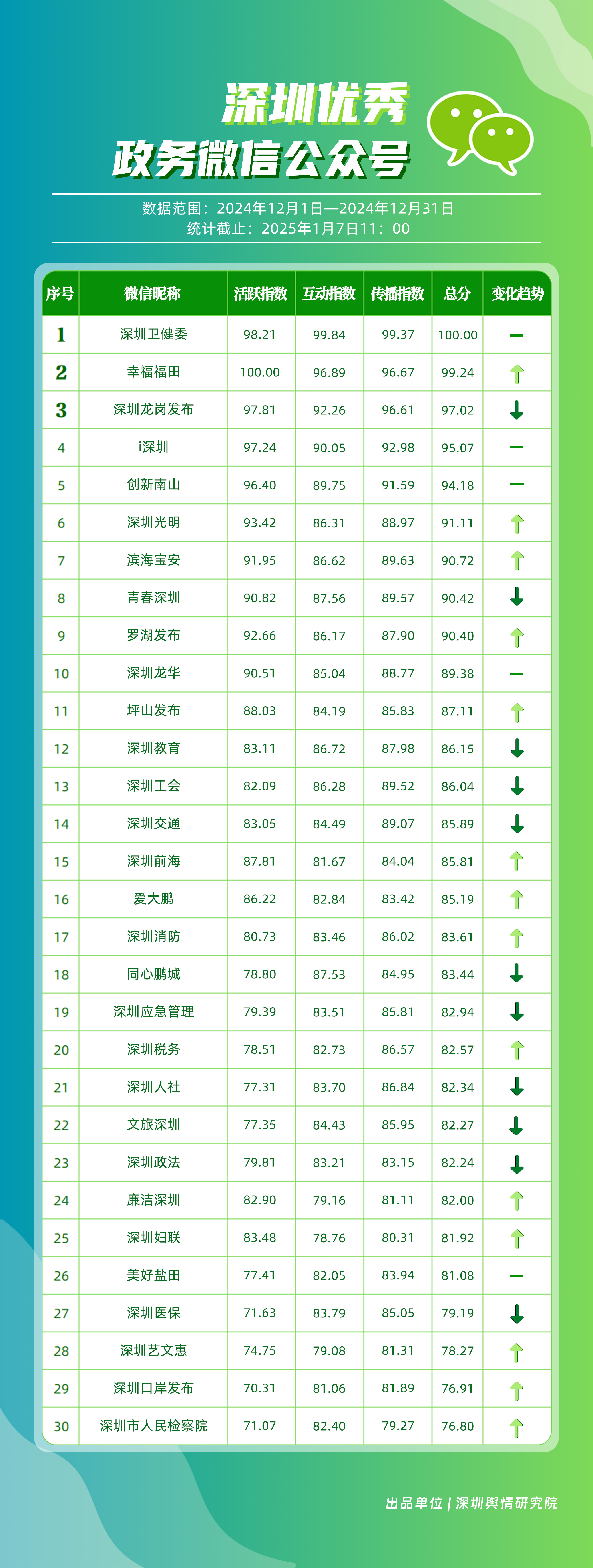 12月,“深圳衛(wèi)健委”“幸福福田”“深圳龍崗發(fā)布”“i深圳”“創(chuàng)新南山”“深圳光明”“濱海寶安”“青春深圳”“羅湖發(fā)布”“深圳龍華”等30個(gè)賬號(hào)入選“深圳優(yōu)秀政務(wù)微信公眾號(hào)”。其中,“深圳衛(wèi)健委”位于榜單首位,總分為100分?!靶腋8L铩薄吧钲诠饷鳌薄盀I海寶安”“羅湖發(fā)布”排名在本期有所提升,展現(xiàn)了他們不斷提升的傳播力、影響力?!癷深圳”“創(chuàng)新南山”則保持了穩(wěn)定的排名,持續(xù)在政務(wù)信息宣傳中發(fā)揮著重要作用。