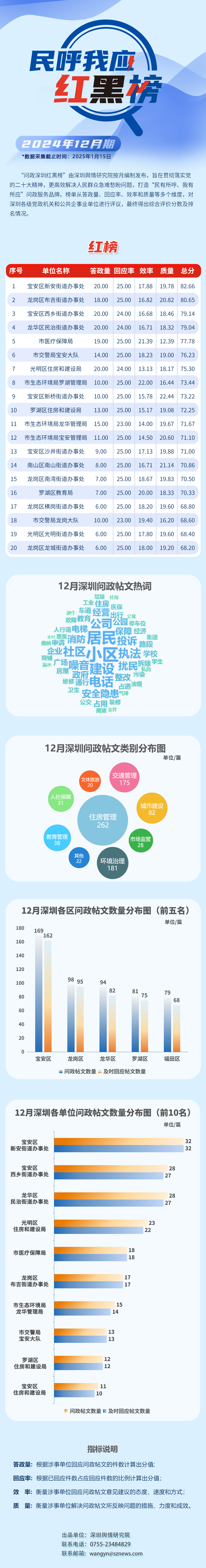 2024年12月,共有20家單位因積極解決民生問(wèn)題,認(rèn)真細(xì)致答政,登上“紅榜”,它們分別是:寶安區(qū)新安街道辦事處、龍崗區(qū)布吉街道辦事處、寶安區(qū)西鄉(xiāng)街道辦事處、龍華區(qū)民治街道辦事處、市醫(yī)療保障局、市交警局寶安大隊(duì)、光明區(qū)住房和建設(shè)局、市生態(tài)環(huán)境局羅湖管理局、寶安區(qū)新橋街道辦事處、羅湖區(qū)住房和建設(shè)局、市生態(tài)環(huán)境局龍華管理局、市生態(tài)環(huán)境局寶安管理局、寶安區(qū)沙井街道辦事處、南山區(qū)南山街道辦事處、龍崗區(qū)南灣街道辦事處、羅湖區(qū)教育局、龍崗區(qū)橫崗街道辦事處、市交警局龍崗大隊(duì)、光明區(qū)光明街道辦事處、龍崗區(qū)龍城街道辦事處。