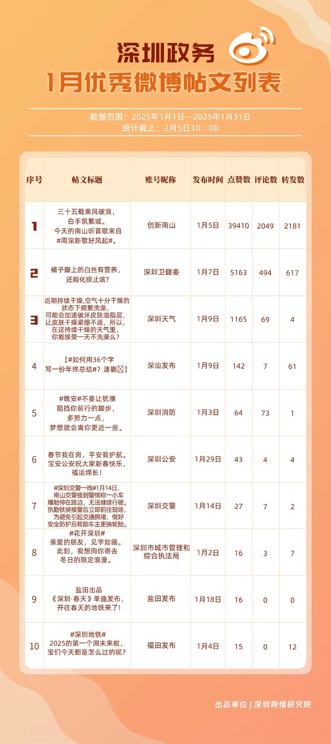 2025年1月期《深圳優(yōu)秀政務(wù)新媒體矩陣》發(fā)布,一同揭曉哪些政務(wù)新媒體矩陣能夠憑借其卓越表現(xiàn)脫穎而出,成為推動政務(wù)信息傳播與服務(wù)模式創(chuàng)新的領(lǐng)航者,引領(lǐng)政務(wù)新媒體運(yùn)營邁向新高度。