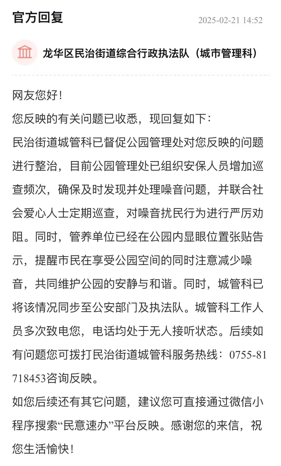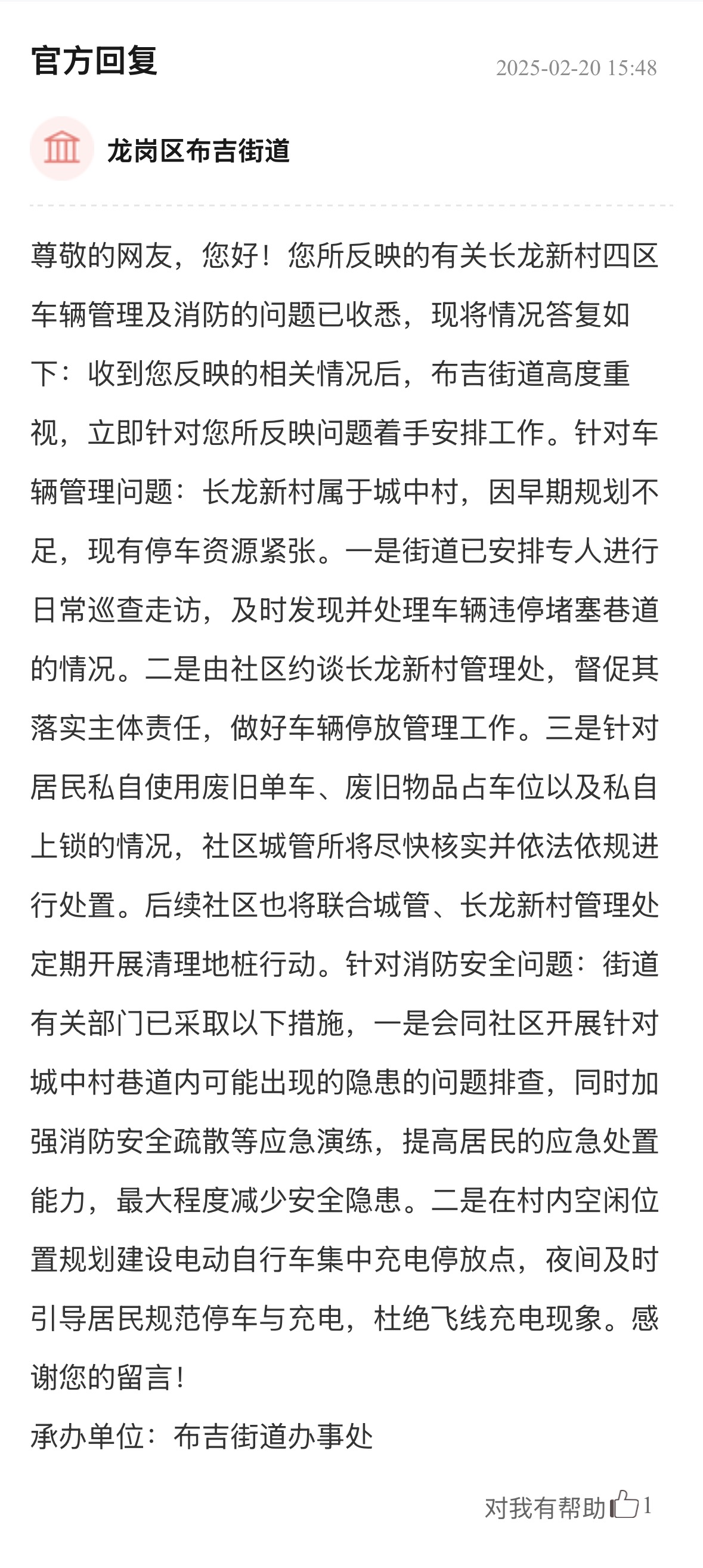 案例點評:街道辦針對車輛管理、消防問題多管齊下,旨在營造一個通暢、安全的出行和生活環(huán)境,態(tài)度值得肯定。回應(yīng)展示了街道辦構(gòu)建的“專項巡查+設(shè)施建設(shè)+行為引導(dǎo)”綜合治理體系,精準直擊問題核心,兼顧當下整治與長遠規(guī)劃,切實保障居民居住和生活安全,其系統(tǒng)性解決思路對同類區(qū)域治理具有重要參考價值。