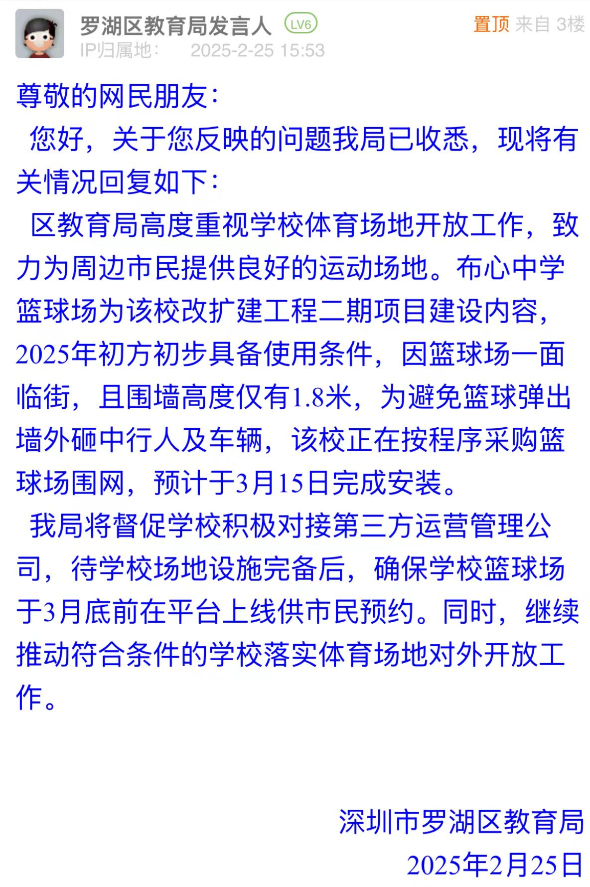 案例點評:市民關(guān)注布心中學籃球場開放時間,反映出對公共運動空間的迫切需求。羅湖區(qū)教育局詳細說明場地未開放原因及施工節(jié)點,并明確后續(xù)開放計劃,有效化解群眾疑慮,有助于“全民健身”政策更好落地。