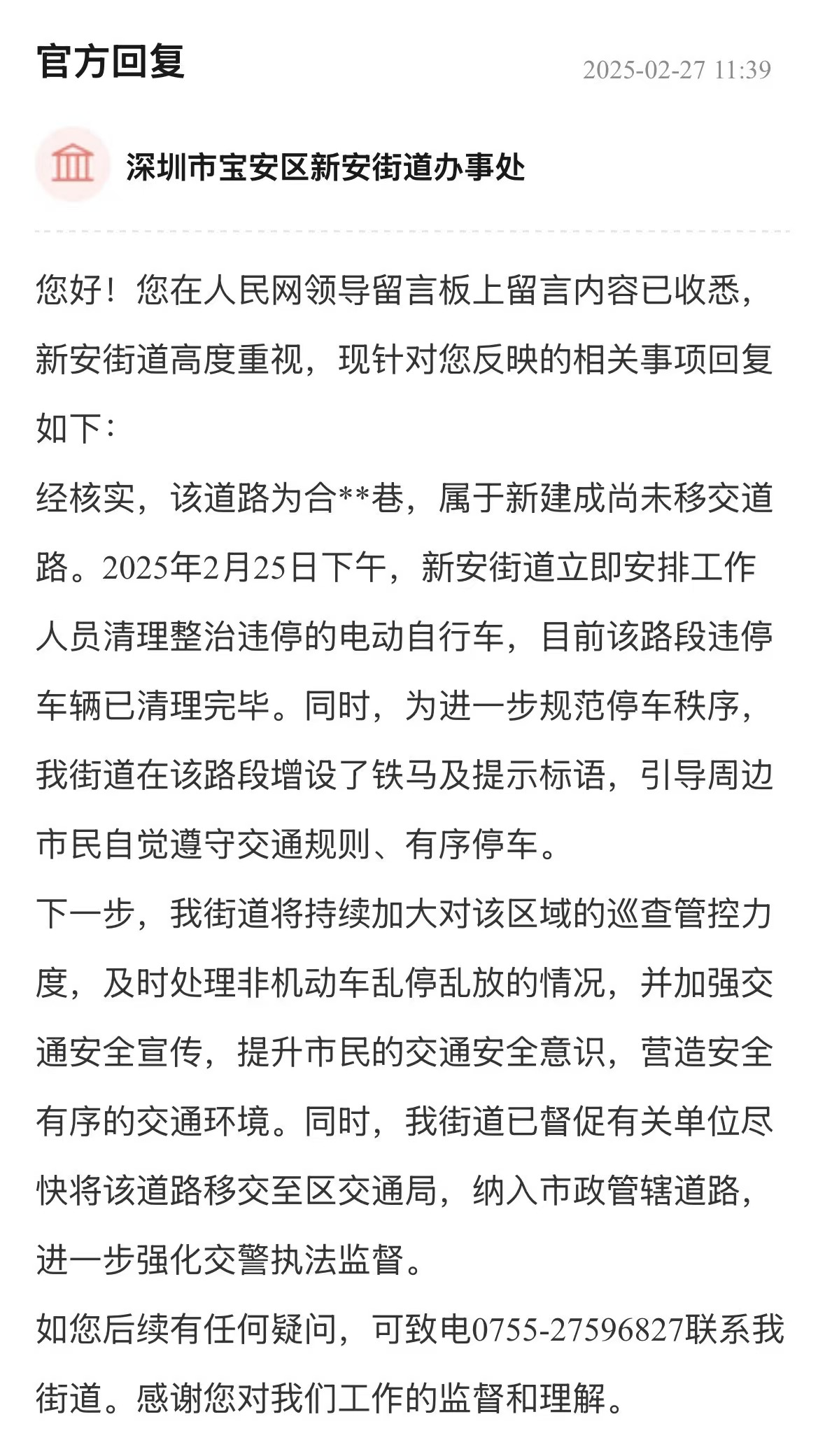 案例點評:非機動車亂停放影響交通和消防安全,嚴重影響市民生活。街道辦行動迅速,第一時間清理違停車輛,增設(shè)鐵馬及提示標語,規(guī)范停車秩序,展現(xiàn)了高效的處置能力。回應(yīng)中,街道還制定了長效治理計劃,構(gòu)建“短期整治+長效管理”模式,有助于解決區(qū)域交通問題,提升城市管理水平。