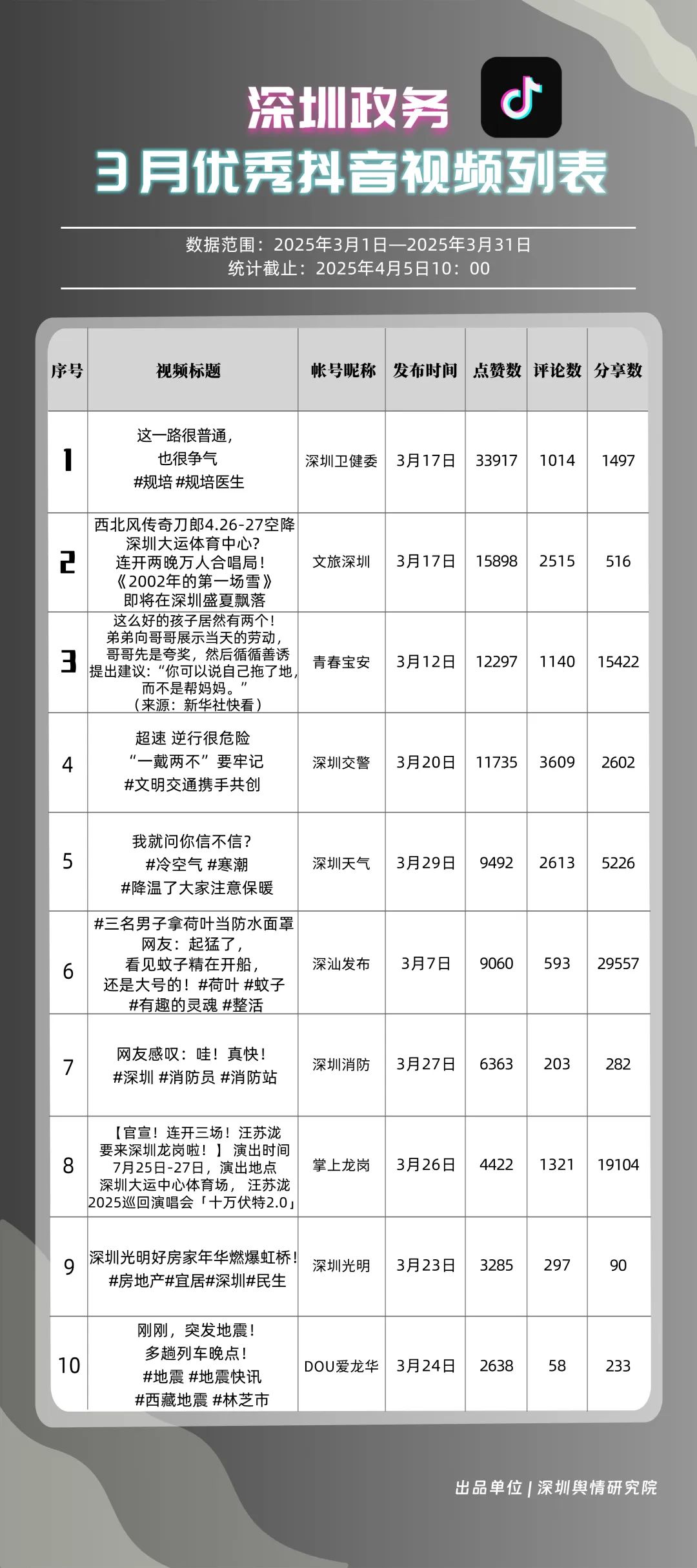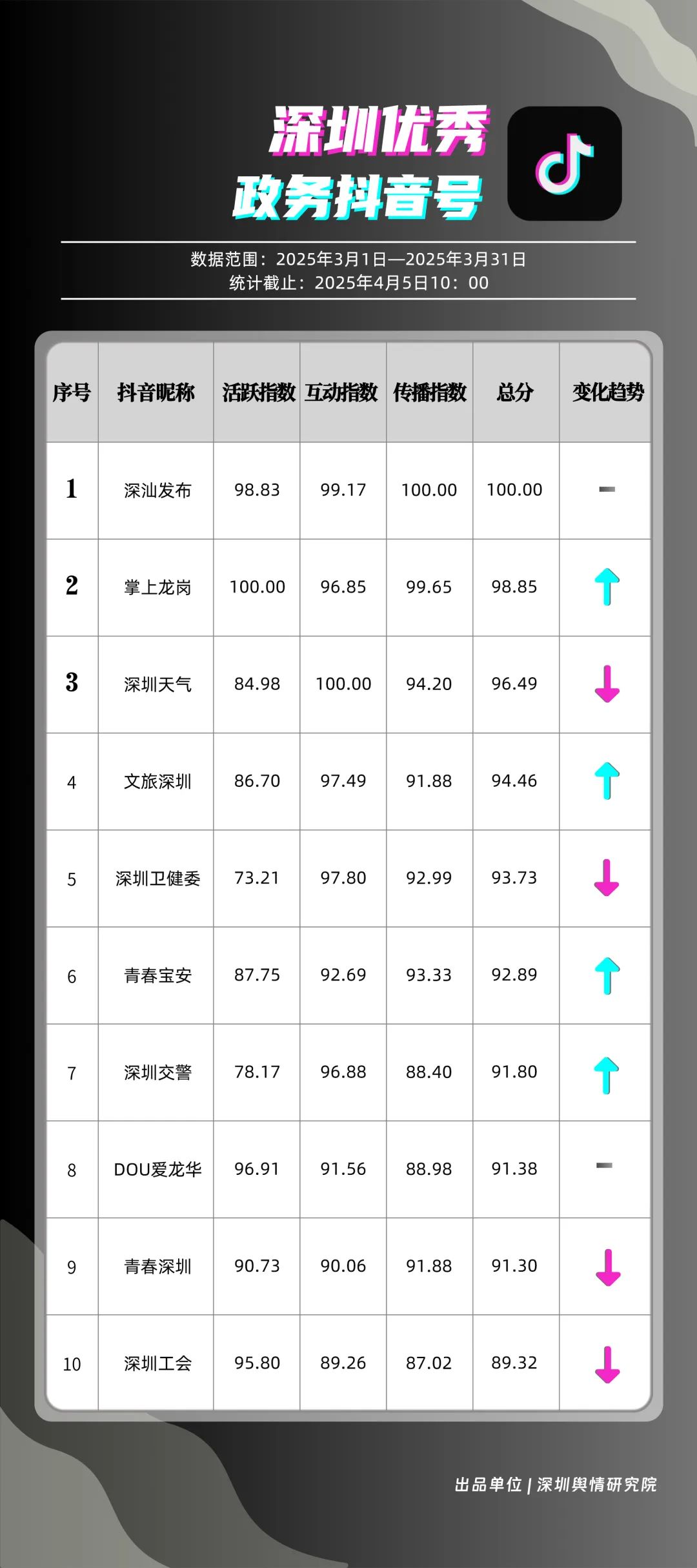 3月,“深汕發(fā)布”“掌上龍崗”“深圳天氣”“文旅深圳”“深圳衛(wèi)健委”“青春寶安”“深圳交警”“DOU愛龍華”“青春深圳”“深圳工會”共10個政務抖音號獲得“深圳優(yōu)秀政務抖音號”稱號。其中,“深汕發(fā)布”位于榜單第一名,3月共收獲5萬余次點贊、8萬余次轉(zhuǎn)發(fā),反映出賬號作品的較高吸引力;“深圳龍崗”以98.85分位于榜單第二名,與榜首分差微小,整體實力不俗。緊隨其后的分別是“深圳天氣”“文旅深圳”“深圳衛(wèi)健委”,三賬號產(chǎn)出內(nèi)容優(yōu)質(zhì),也獲得較高評分。相關(guān)上榜單位展現(xiàn)了深圳政務新媒體賬號在短視頻傳播領(lǐng)域的創(chuàng)新探索力與傳播實效性。