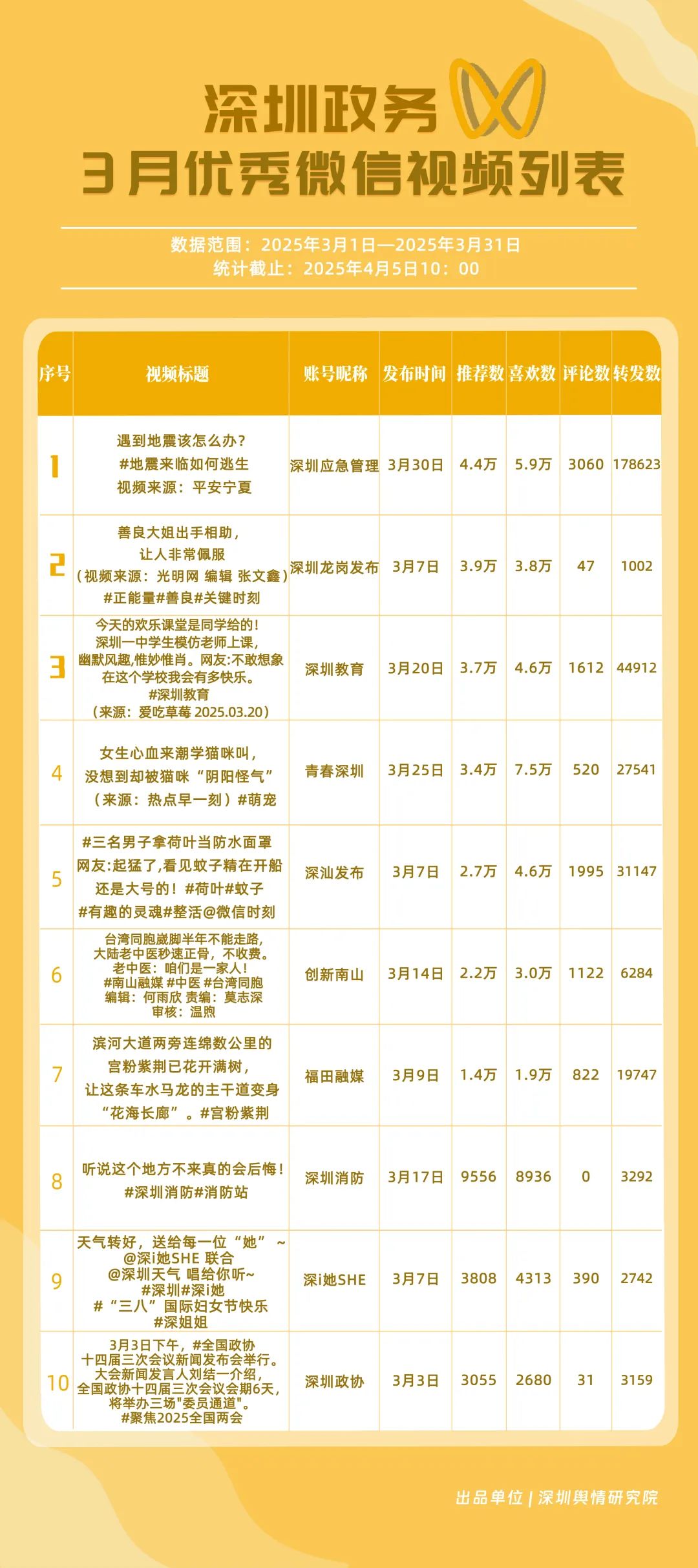 3月,獲“深圳優(yōu)秀政務微信視頻號”稱號的分別是“深圳應急管理”“深圳教育”“深汕發(fā)布”“青春深圳”“創(chuàng)新南山”“福田融媒”“深圳龍崗發(fā)布”“深圳光明”“文旅深圳”“深圳天氣”。其中,“深圳應急管理”以20余篇作品收獲超20萬次轉(zhuǎn)發(fā),躍居第一名,一期有關(guān)“地震來臨如何逃生”的視頻收獲超17萬次轉(zhuǎn)發(fā),展現(xiàn)了其內(nèi)容的高實用性。“深圳教育”“深汕發(fā)布”位于榜單第二、三位,總分超90分,反映出兩賬號在民生教育、區(qū)域宣傳領(lǐng)域擁有較好傳播效果?!扒啻荷钲凇薄皠?chuàng)新南山”“福田融媒”等賬號也在3月發(fā)布優(yōu)質(zhì)視頻內(nèi)容,展現(xiàn)了深圳政務新媒體在視頻號平臺宣傳的創(chuàng)新探索。