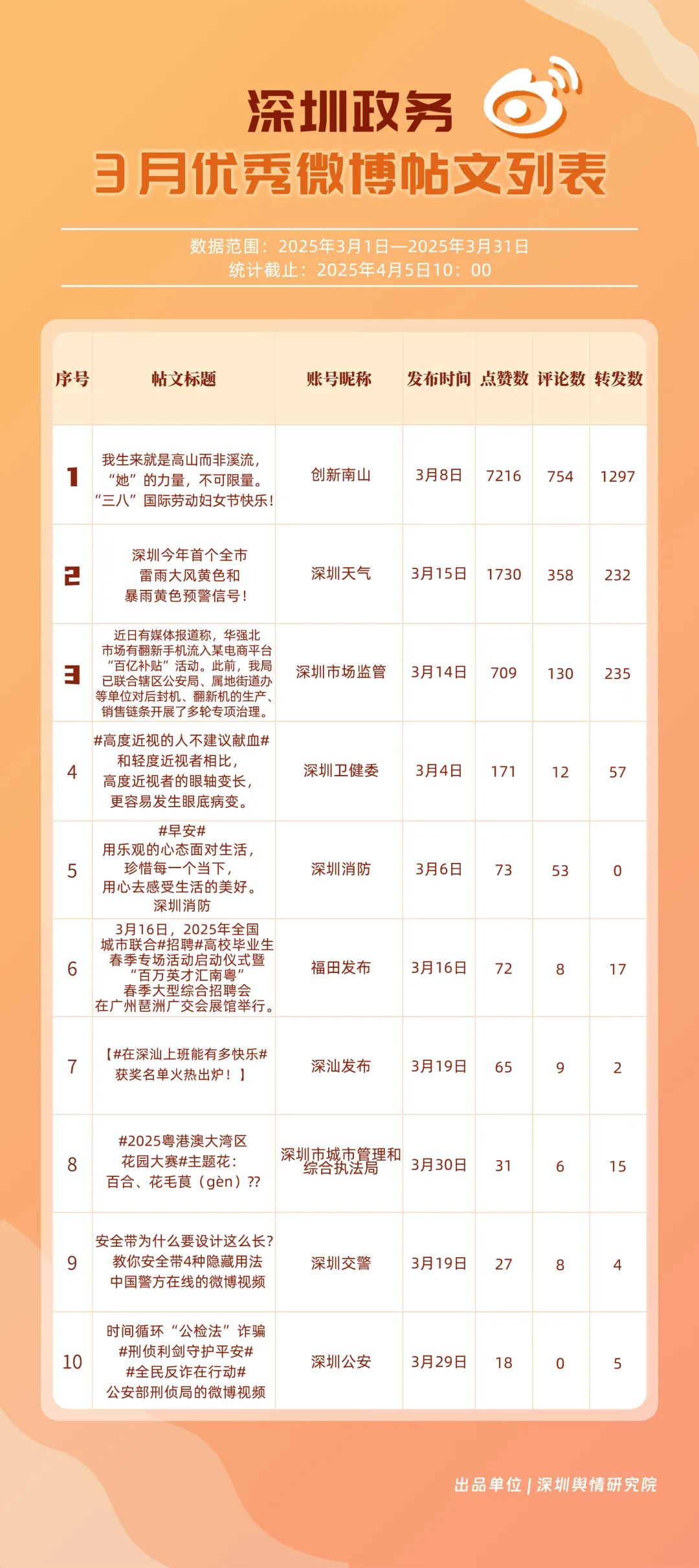 3月,“深圳天氣”“創(chuàng)新南山”“深圳衛(wèi)健委”“深圳消防”“福田發(fā)布”“深圳應急管理”“深圳公安”“深圳市場監(jiān)管”“深圳龍崗發(fā)布”“深圳市城市管理和綜合執(zhí)法局”等20個賬號入選“優(yōu)秀政務微博號”。值得一提的是,“深圳天氣”賬號在3月共獲得點贊超11萬,相較其他賬號具備顯著優(yōu)勢?!皠?chuàng)新南山”“深圳衛(wèi)健委”“深圳消防”也位列前茅,分差微小,競爭激烈。從領(lǐng)域分布來看,上榜賬號不僅包括區(qū)級賬號,還涵蓋民生服務、應急科普、城市治理等單位賬號,體現(xiàn)了深圳政務新媒體在多領(lǐng)域的強大影響力。