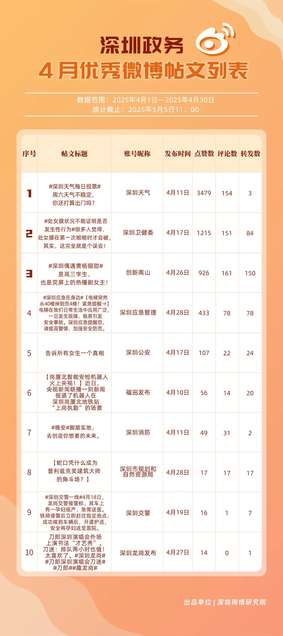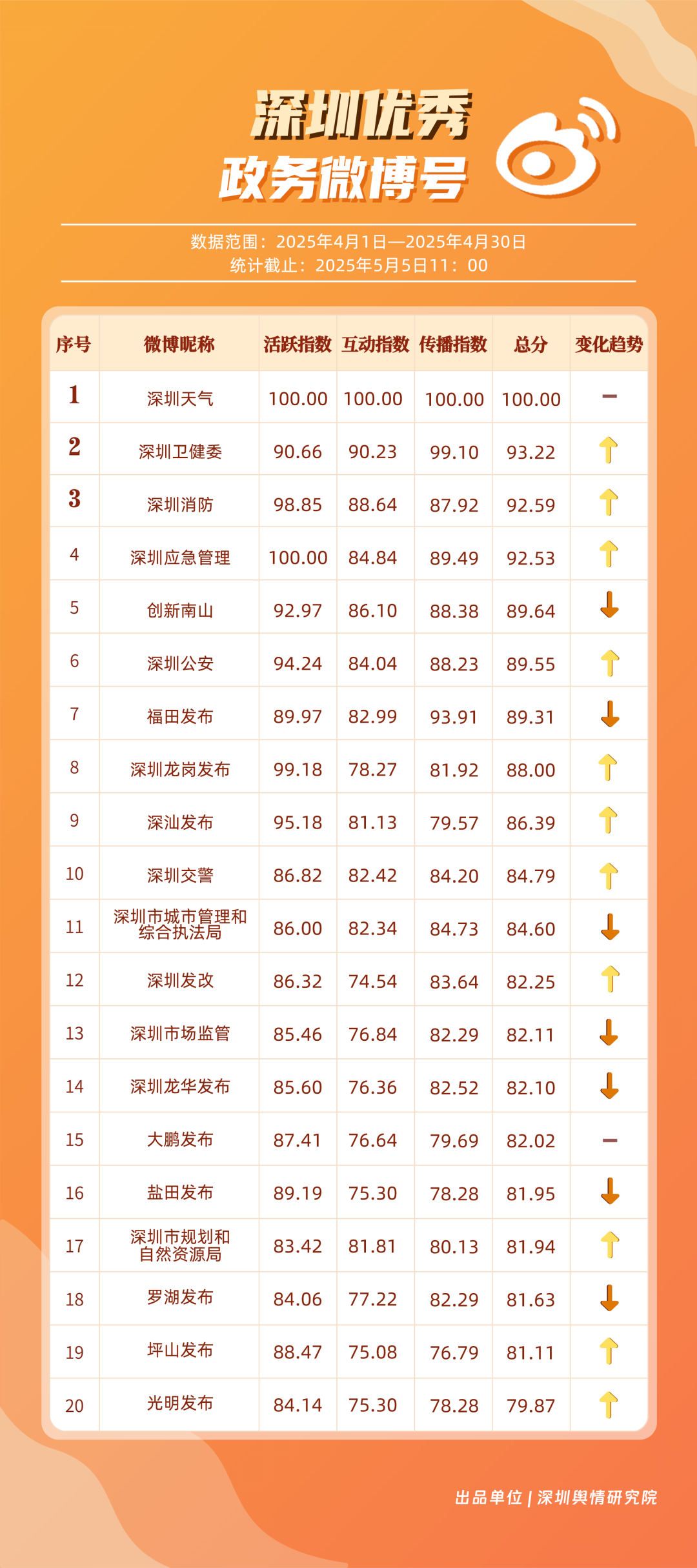 4月,“深圳天氣”“深圳衛(wèi)健委”“深圳消防”“深圳應(yīng)急管理”“創(chuàng)新南山”“深圳公安”“福田發(fā)布”“深圳龍崗發(fā)布”“深汕發(fā)布”“深圳交警”等20個賬號入選“優(yōu)秀政務(wù)微博號”。值得一提的是,“深圳天氣”在多個指標(biāo)中獲得滿分,其氣象信息的趣味性和實用性受到市民認可;“深圳衛(wèi)健委”“深圳消防”“深圳應(yīng)急管理”也在信息傳播、互動服務(wù)等方面持續(xù)發(fā)力,以超過90分的總分緊跟其后;“深汕發(fā)布”“深圳交警”相較于3月在榜單排名有所提升,展現(xiàn)出強勁的發(fā)展勢頭。這些優(yōu)秀政務(wù)微博號的脫穎而出,不僅體現(xiàn)了各自的運營實力,更反映出深圳政務(wù)新媒體在微博平臺的蓬勃發(fā)展態(tài)勢。