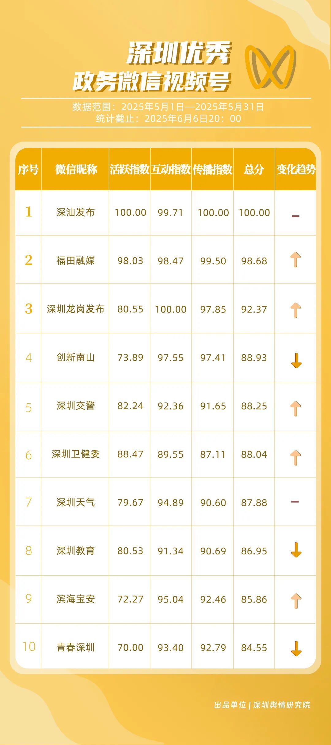 2025年5月期《深圳優(yōu)秀政務(wù)新媒體矩陣》發(fā)布,讓我們共同關(guān)注哪些矩陣以精準(zhǔn)傳播、智慧服務(wù)與創(chuàng)新實(shí)踐,在政務(wù)新媒體領(lǐng)域打造出具有示范價(jià)值的標(biāo)桿案例,以矩陣合力構(gòu)建政務(wù)傳播新生態(tài),為深圳城市網(wǎng)絡(luò)形象塑造持續(xù)注入新動(dòng)能。