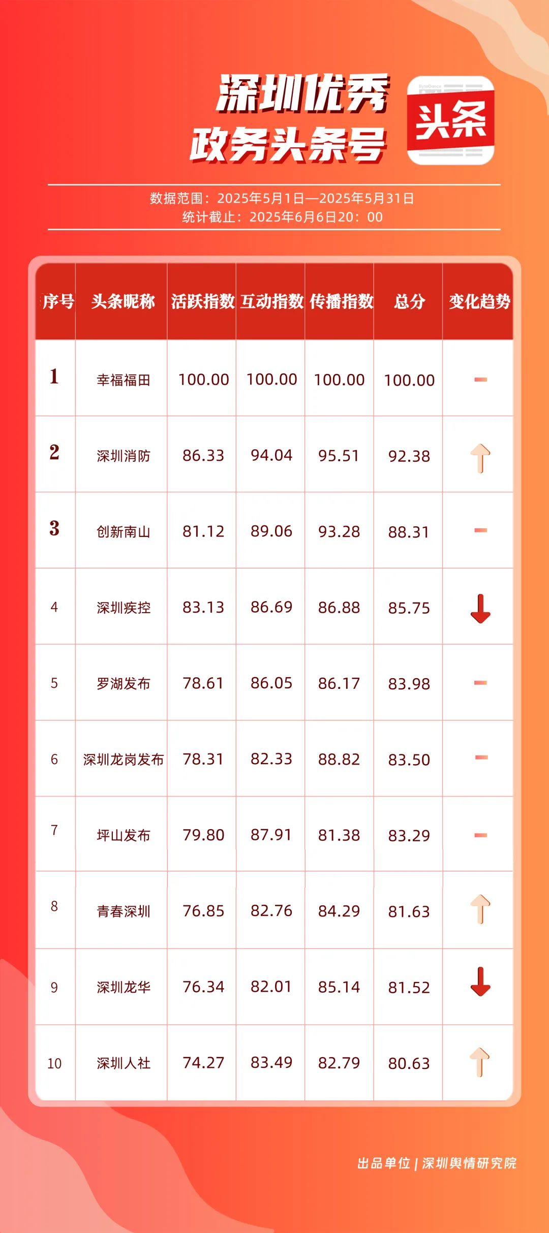 5月,“幸福福田”“深圳消防”“創(chuàng)新南山”“深圳疾控”“羅湖發(fā)布”“深圳龍崗發(fā)布”“坪山發(fā)布”“青春深圳”“深圳龍華”“深圳人社”共10個(gè)政務(wù)頭條號(hào)入選“優(yōu)秀政務(wù)頭條號(hào)”榜單。在榜單前三名中,“幸福福田”“創(chuàng)新南山”以穩(wěn)定且高質(zhì)量的內(nèi)容輸出,持續(xù)領(lǐng)跑,排名較上個(gè)月未發(fā)生變動(dòng)。位居榜單第二的“深圳消防”同樣表現(xiàn)亮眼,排名較上個(gè)月提升2個(gè)名次,充分展現(xiàn)了其在消防安全宣傳領(lǐng)域的持續(xù)深耕和創(chuàng)新突破。上榜政務(wù)頭條號(hào)各展所長,以優(yōu)質(zhì)內(nèi)容為核心,充分發(fā)揮平臺(tái)傳播優(yōu)勢(shì),為政務(wù)信息的高效觸達(dá)與廣泛傳播樹立了標(biāo)桿。