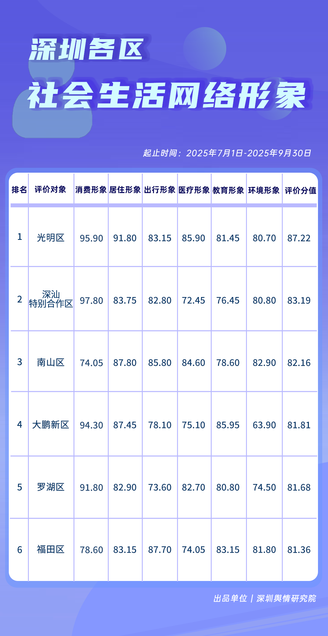 2.《深圳各區(qū)網絡形象建設榜》從深圳各區(qū)的網絡聲量聚合形象(100分)、社會生活網絡形象(100分)、新媒體傳播形象(100分)、網絡輿情形象(100分)四個維度展開綜合評價、計分排名,最終形成榜單。