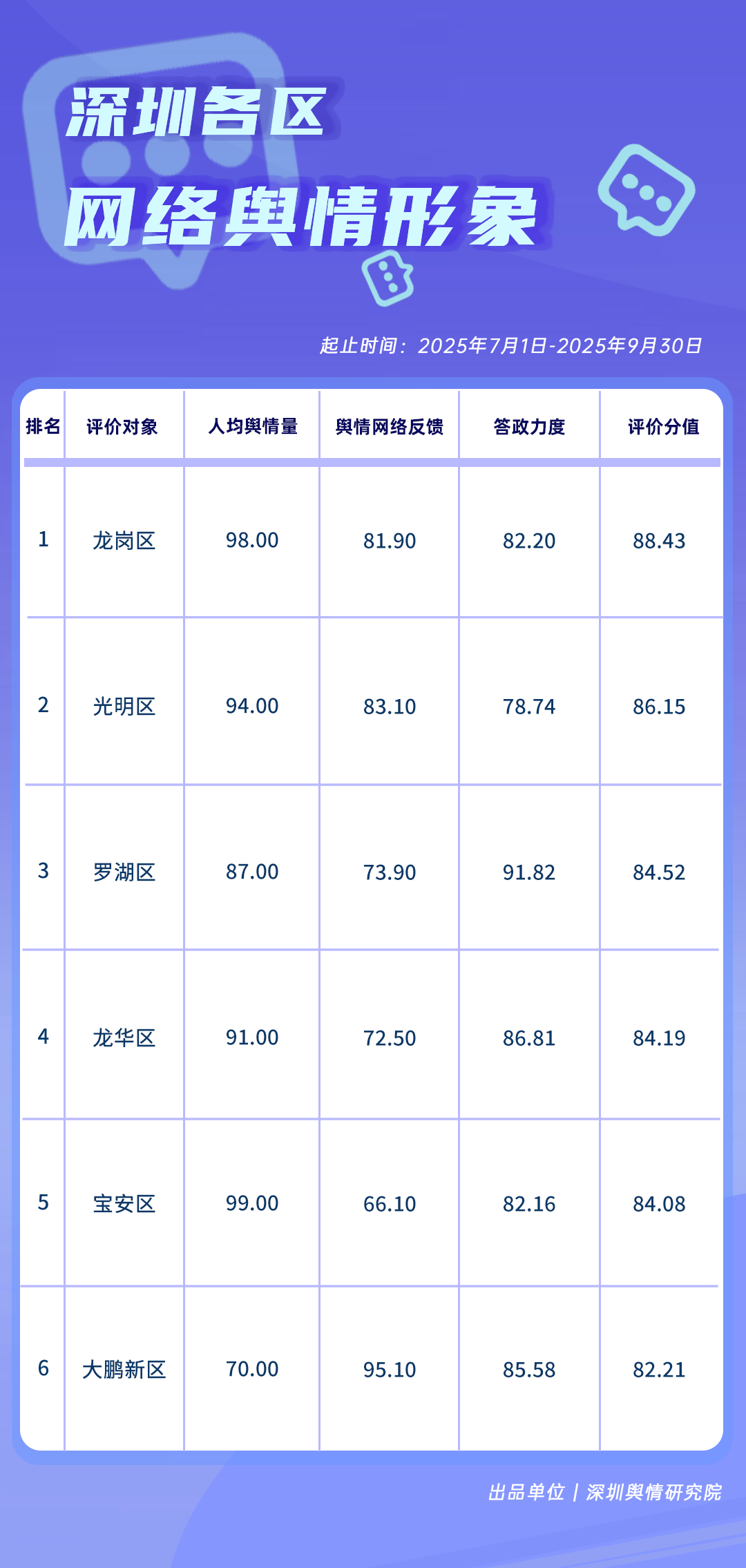 7-9月,各區(qū)各單位網絡形象建設成效如何?《深圳各區(qū)各單位網絡形象建設榜》帶您了解。本期榜單數據統(tǒng)計時間范圍為2025年7月1日至9月30日。