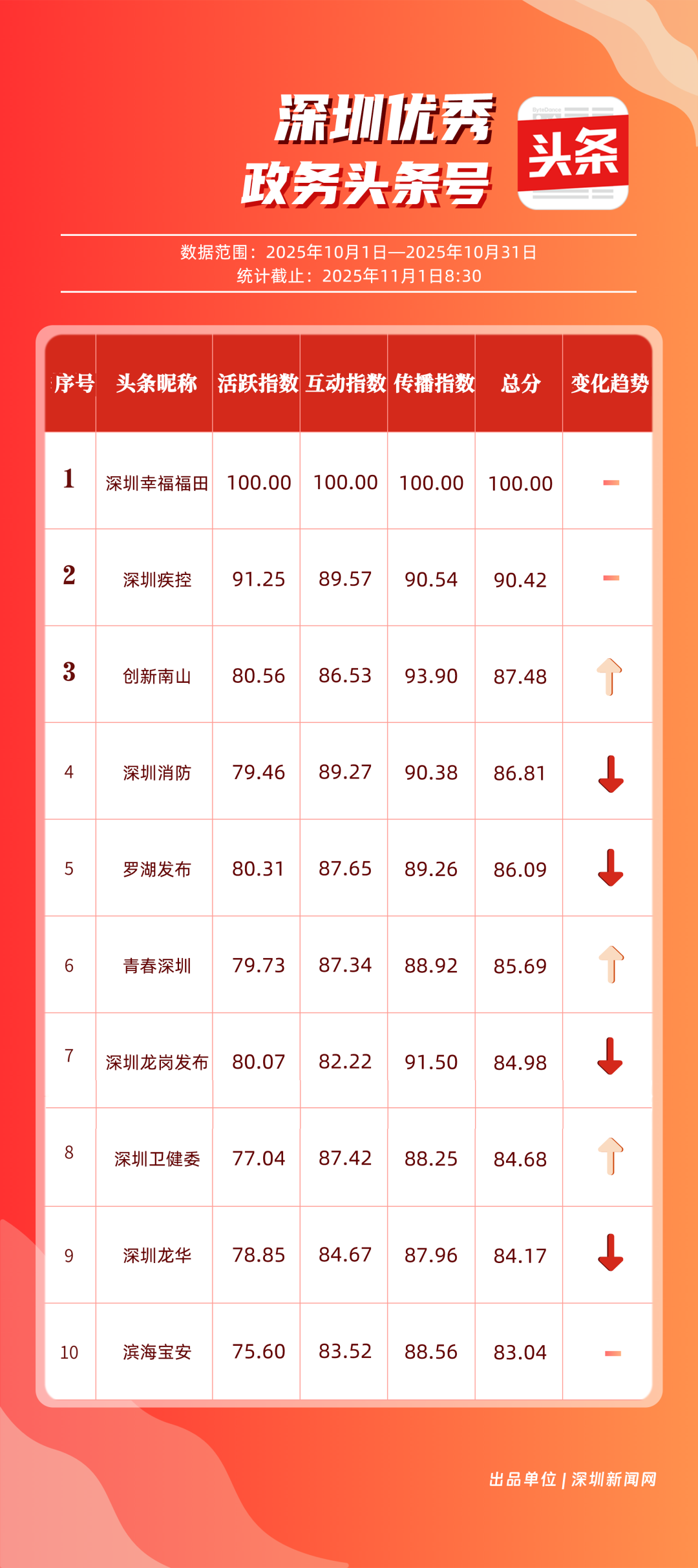 10月,“深圳幸福福田”“深圳疾控”“創(chuàng)新南山”“深圳消防”“羅湖發(fā)布”“青春深圳”“深圳龍崗發(fā)布”“深圳衛(wèi)健委”“深圳龍華”“濱海寶安”共10個政務(wù)頭條號入選“優(yōu)秀政務(wù)頭條號”榜單。“深圳幸福福田”在活躍、互動、傳播均收獲較好成果,蟬聯(lián)榜首;“深圳疾控”得分超90分,持續(xù)發(fā)布民生健康類內(nèi)容,為市民健康保駕護航;“創(chuàng)新南山”內(nèi)容創(chuàng)作緊扣民生與區(qū)域特色,位列榜單第三名?!吧钲谙馈薄傲_湖發(fā)布”等賬號也位列榜單前列,成為區(qū)域政務(wù)新媒體內(nèi)容創(chuàng)新、信息傳遞的標桿。