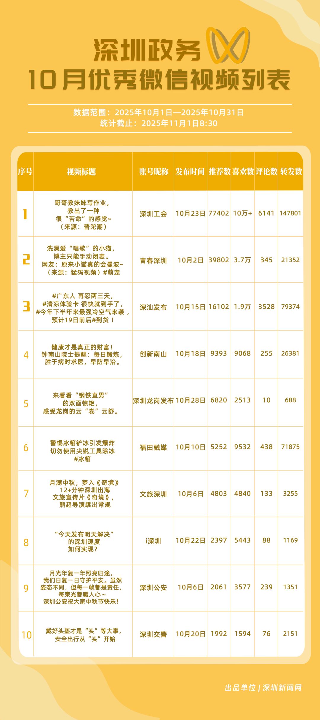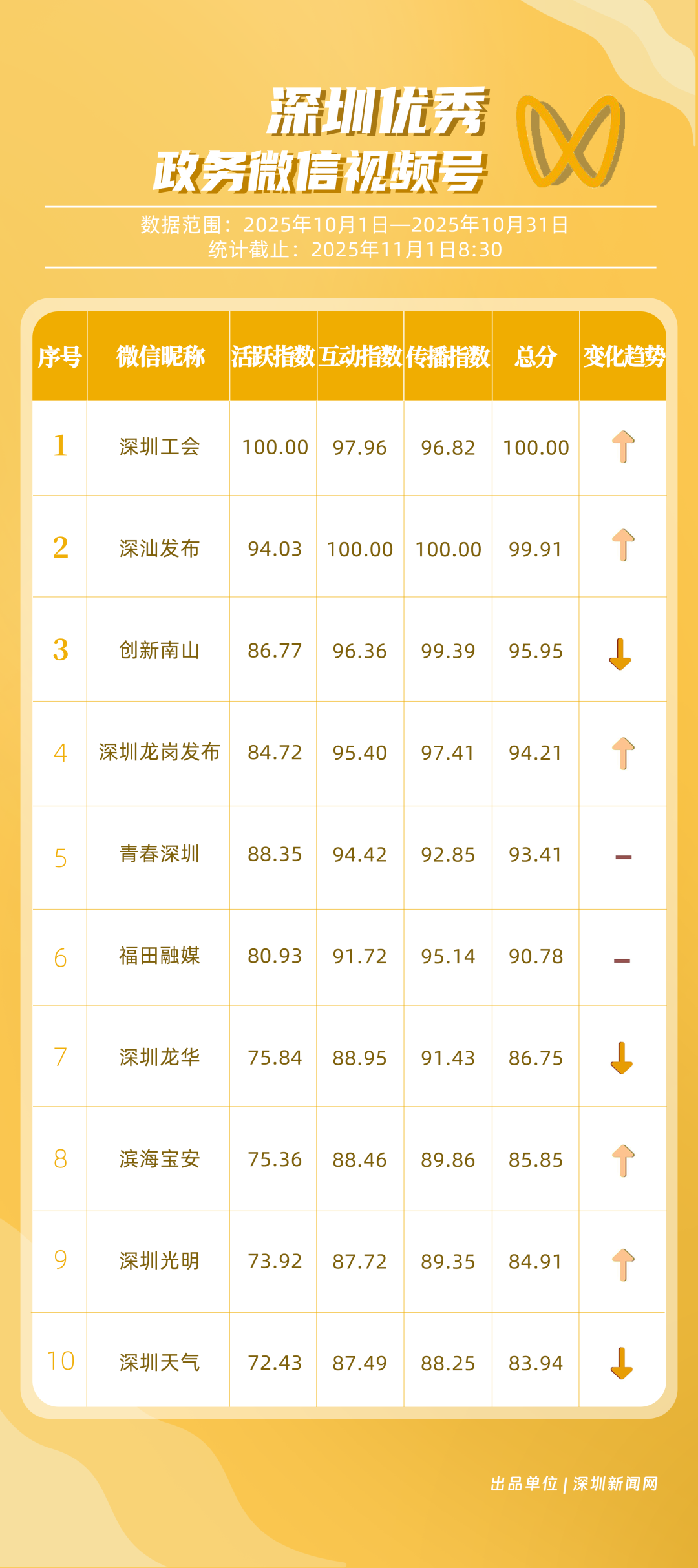 10月“深圳優(yōu)秀政務(wù)新媒體矩陣”榜單揭曉,這6個矩陣排名有上升!