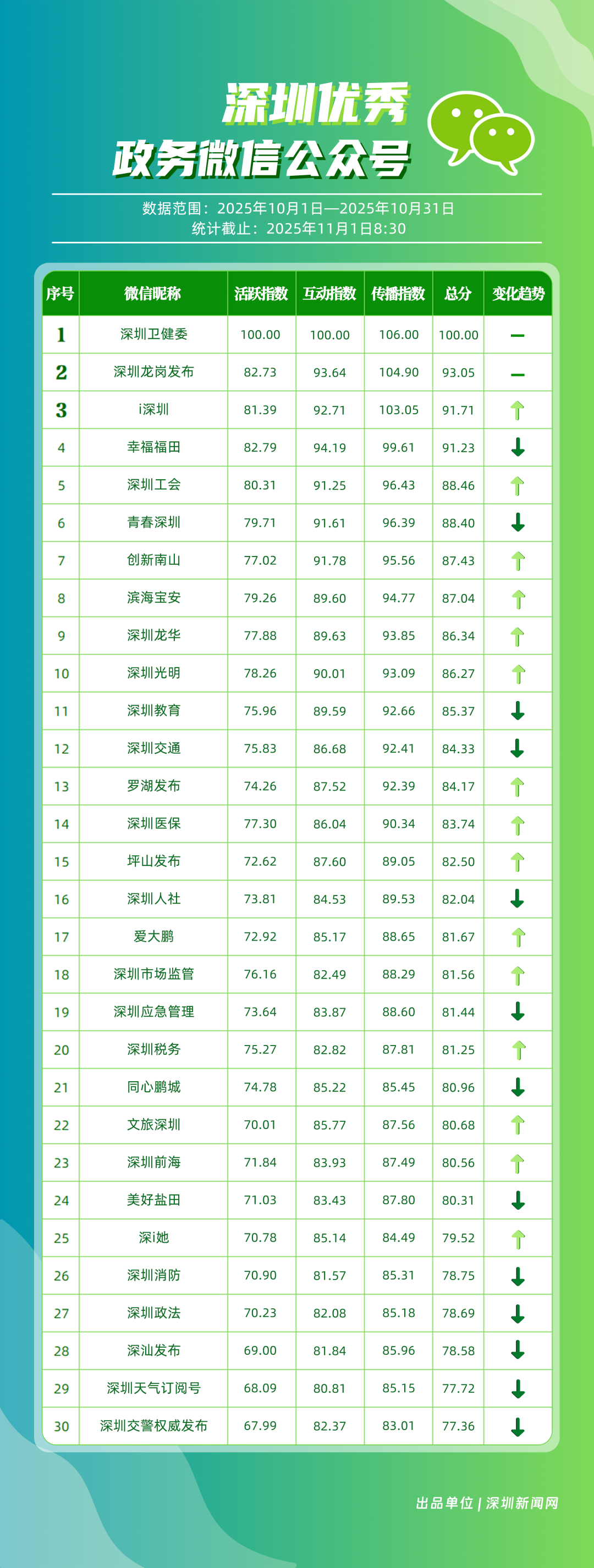 10月,“深圳衛(wèi)健委”“深圳龍崗發(fā)布”“i深圳”“幸福福田”“深圳工會”“青春深圳”“創(chuàng)新南山”“濱海寶安”“深圳龍華”“深圳光明”等30個政務(wù)微信公眾號榮登“深圳優(yōu)秀政務(wù)微信公眾號”榜單。10月,“深圳衛(wèi)健委”以總分100位居榜首,其持續(xù)以真誠、反套路的內(nèi)容,將專業(yè)健康知識轉(zhuǎn)化為網(wǎng)民喜聞樂見的“生活指南”,受到大量網(wǎng)民喜愛;“深圳龍崗發(fā)布”位居第二,持續(xù)發(fā)布高質(zhì)量內(nèi)容,成為市民獲取龍崗動態(tài)的“第一窗口”;“i深圳”也發(fā)布政策、民生內(nèi)容,排名有所上升,位列第三;“幸福福田”“深圳工會”等也立足區(qū)域特色,通過多元內(nèi)容,展現(xiàn)各自的發(fā)展活力。