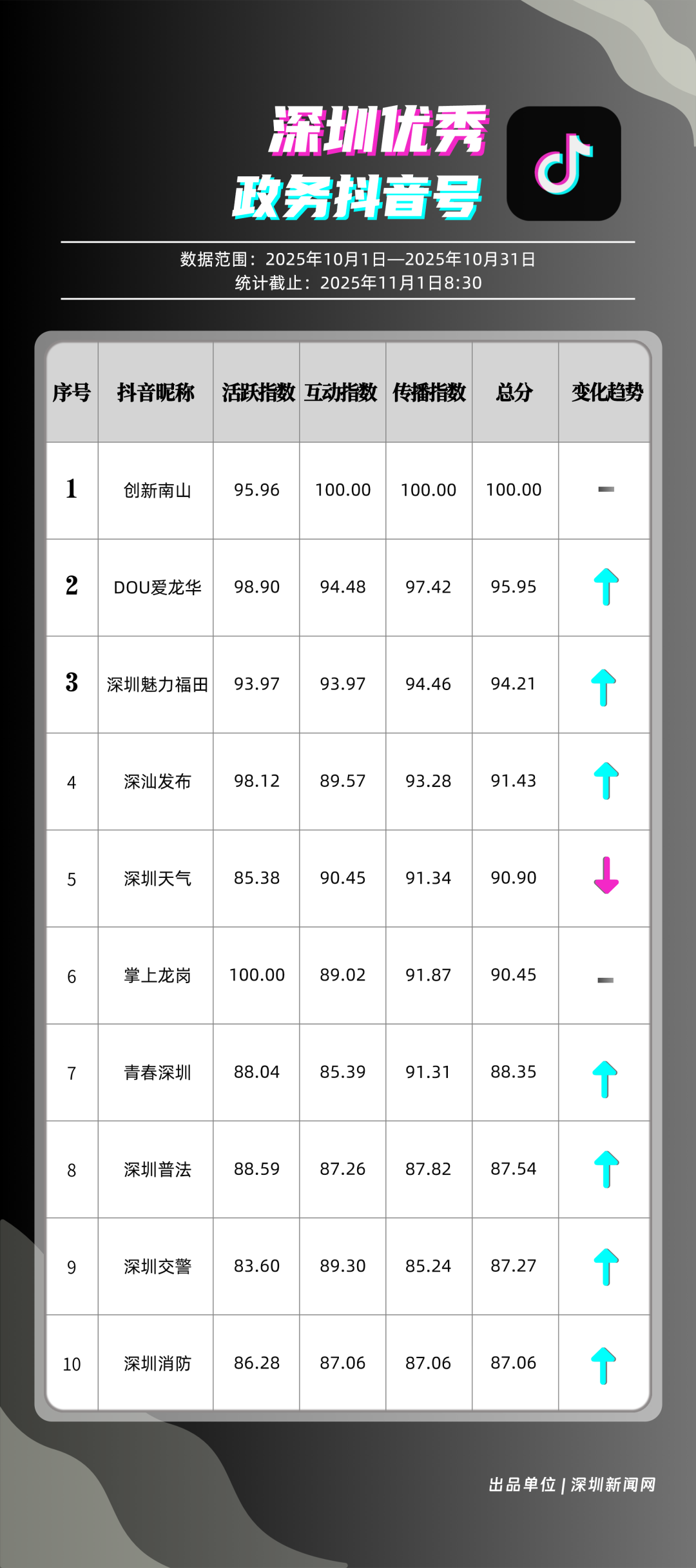 10月,獲得“優(yōu)秀政務(wù)抖音號”稱號的是“創(chuàng)新南山”“DOU愛龍華”“深圳魅力福田”“深汕發(fā)布”“深圳天氣”“掌上龍崗”“青春深圳”“深圳普法”“深圳交警”“深圳消防”?!皠?chuàng)新南山”以總分100分居于榜首,展現(xiàn)出其內(nèi)容創(chuàng)作對用戶的強大吸引力與傳播力;“DOU愛龍華”與“深圳魅力福田”分別位列第二、三位,得分在95分左右,排名較上期有所上升。“深汕發(fā)布”“深圳天氣”“掌上龍崗”等賬號得分均在90分以上,以年輕化表達展示實用信息,也收獲較好互動、傳播成績。