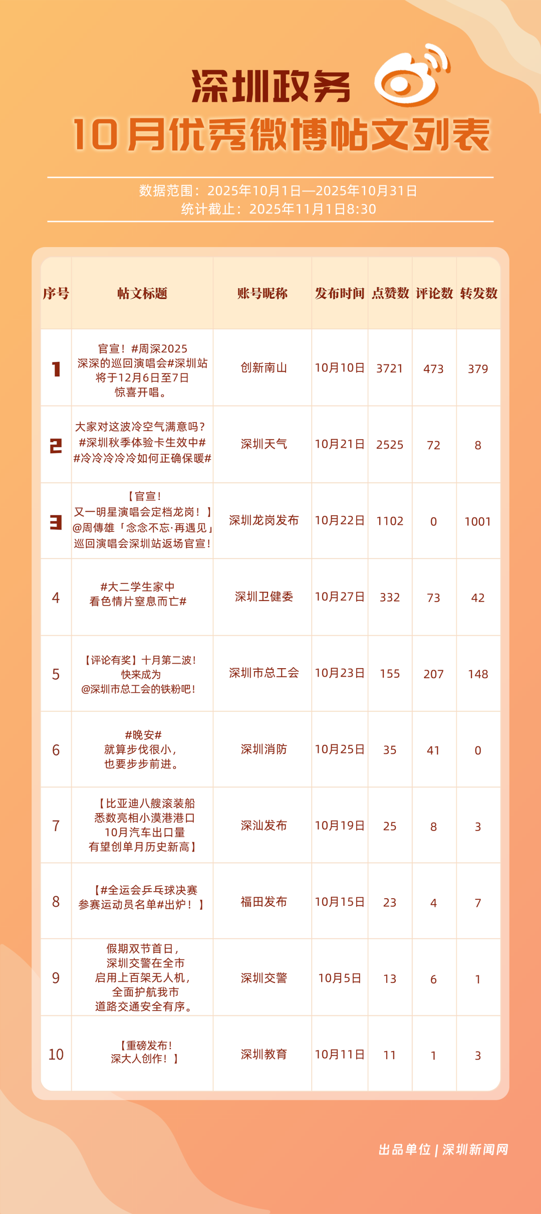 10月,20個賬號入選“優(yōu)秀政務(wù)微博號”榜單,其中包括:“深圳天氣”“深圳龍崗發(fā)布”“深圳市總工會”“深圳消防”“創(chuàng)新南山”“福田發(fā)布”“深圳衛(wèi)健委”“深汕發(fā)布”“深圳應(yīng)急管理”“深圳公安”等。其中,“深圳天氣”高頻、及時地發(fā)布天氣相關(guān)內(nèi)容,其中多篇關(guān)于“冷空氣”“入秋”帖文收獲較好互動和傳播效果,以100分位列榜單首位;“深圳龍崗發(fā)布”總分97.37分,居于榜單第二,其有關(guān)演唱會定檔、卷尺哥等內(nèi)容的帖文獲得較好數(shù)據(jù);“深圳市總工會”關(guān)注職工日常生活,以97.03分居于榜單第三。“深圳消防”“創(chuàng)新南山”等微博賬號也通過各自的特色內(nèi)容,展現(xiàn)深圳城市治理、民生服務(wù)的溫度。