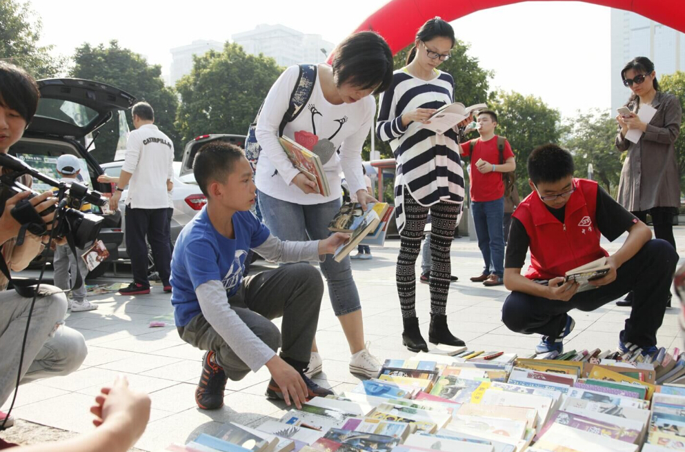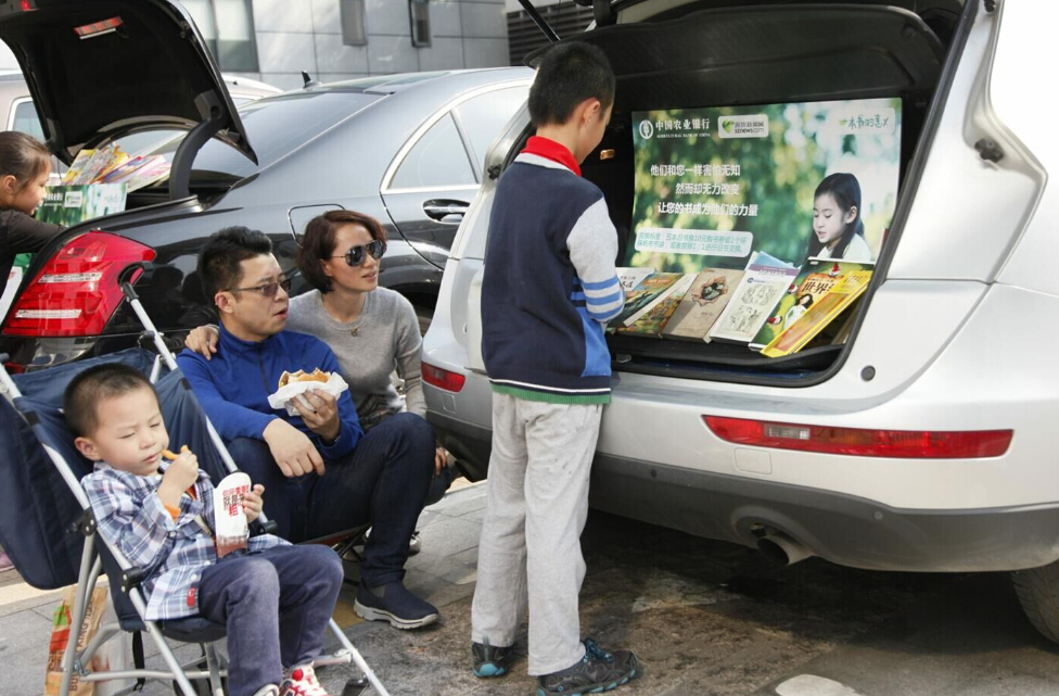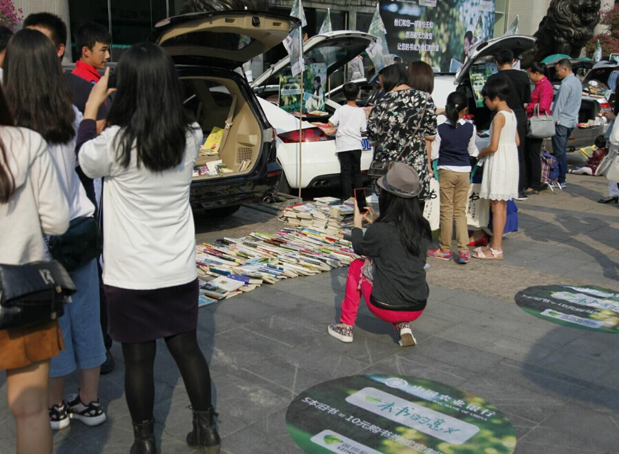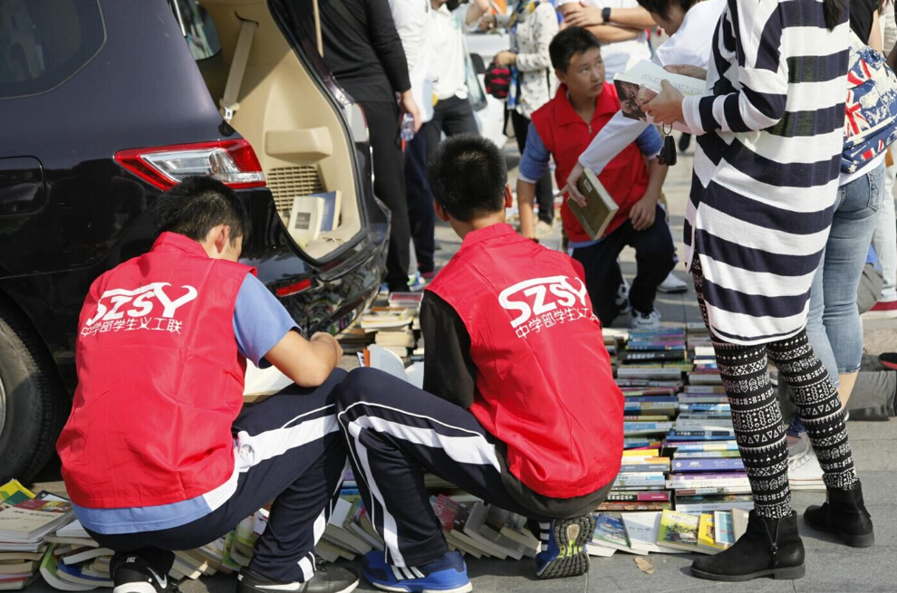 • 深圳市實(shí)驗(yàn)中學(xué)的車尾箱展位前圍滿了前來(lái)?yè)Q書的人