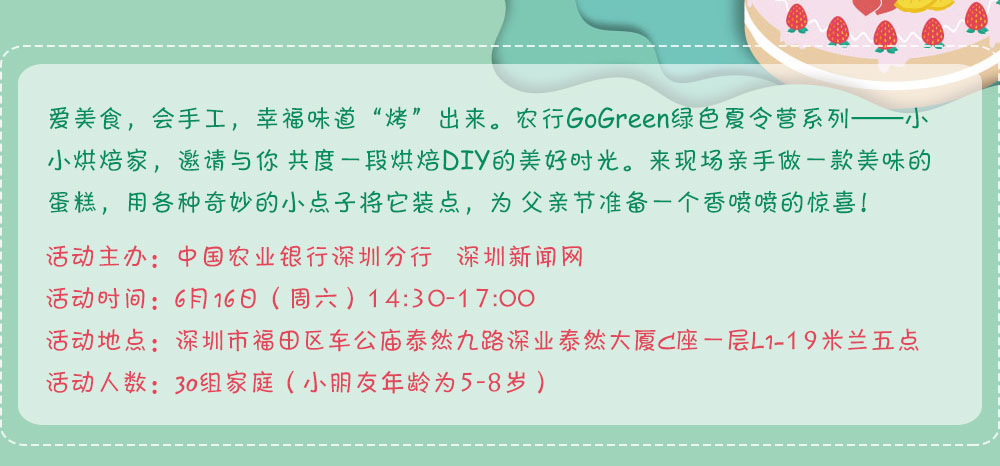 6月16日下午,中國(guó)農(nóng)業(yè)銀行深圳市分行聯(lián)合深圳新聞網(wǎng)開(kāi)展了一場(chǎng)以親子體驗(yàn)為主題的Go Green綠色夏令營(yíng)之“小小烘焙家”活動(dòng),讓孩子們通過(guò)DIY蛋糕培養(yǎng)動(dòng)手能力和創(chuàng)造能力,為爸爸送上一份特別的父親節(jié)禮物。[詳細(xì)]