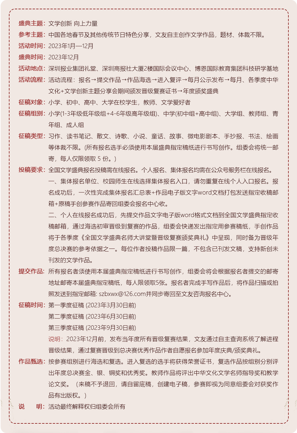 全國文學(xué)盛典2022年度總決賽優(yōu)秀獎獲獎代表合影全國文學(xué)盛典2022年度總決賽優(yōu)秀獎獲獎代表合影全國文學(xué)盛典2022年度總決賽金獎獲獎選手代表合影全國文學(xué)盛典2022年度總決賽銀獎獲獎選手代表合影全國文學(xué)盛典2022年度總決賽銅獎獲獎選手代表合影中華文化文學(xué)創(chuàng)新名師指導(dǎo)獎獲獎代表合影中華文化文學(xué)創(chuàng)新名師指導(dǎo)獎獲獎代表合影2023年度中華文化現(xiàn)行倡導(dǎo)者、特聘鵬城小記者、中華文化文學(xué)創(chuàng)作特長生人才庫入選代表合影優(yōu)秀書香家庭獲獎代表合影獲獎代表李睿頤、張文瑄帶來了精彩的表演中華文化文學(xué)盛典特聘專家獲獎代表合影中華文化文學(xué)盛典名校長獲獎代表合影中華文化創(chuàng)新文學(xué)示范校獲獎代表合影活動現(xiàn)場,“全國文學(xué)盛典名師大講堂”主講嘉賓謝晨為大家?guī)碇黝}講座全國文學(xué)盛典名師大講堂成員、組委會專家委委員劉翔宇深圳市商品交易市場聯(lián)合會執(zhí)行會長劉鴻強致辭中龍華區(qū)教科院附屬學(xué)校校長黃宇慧致辭中全國文學(xué)盛典系列文創(chuàng)平臺聯(lián)合發(fā)起人肖硯寧致辭中與會的師生文友也通過現(xiàn)場的全國文學(xué)盛典年度精彩活動回顧區(qū),一同重溫過往的經(jīng)歷與會的領(lǐng)導(dǎo)嘉賓、師生文友共同走進全國文學(xué)盛典年度慶典現(xiàn)場展示區(qū)